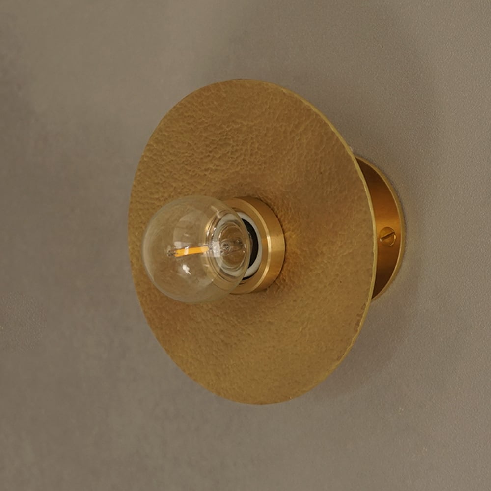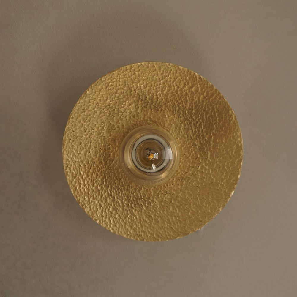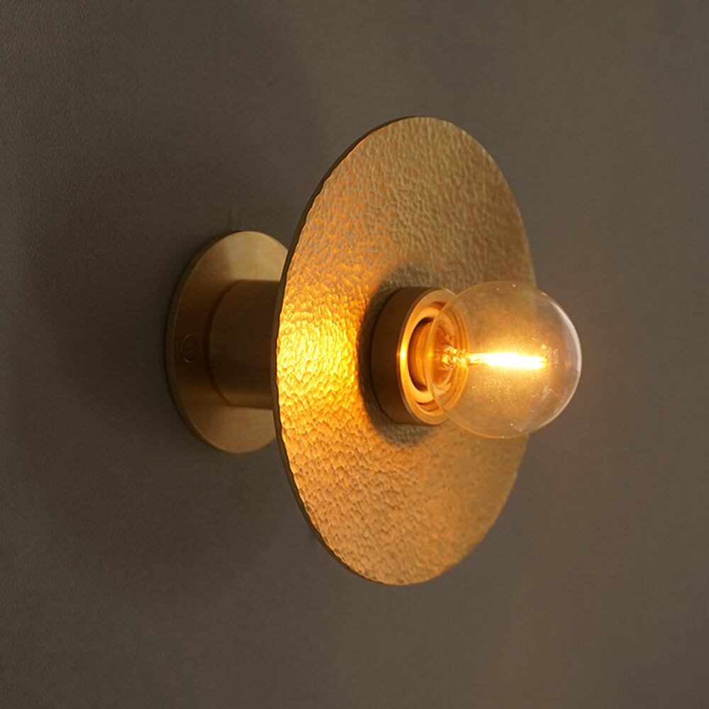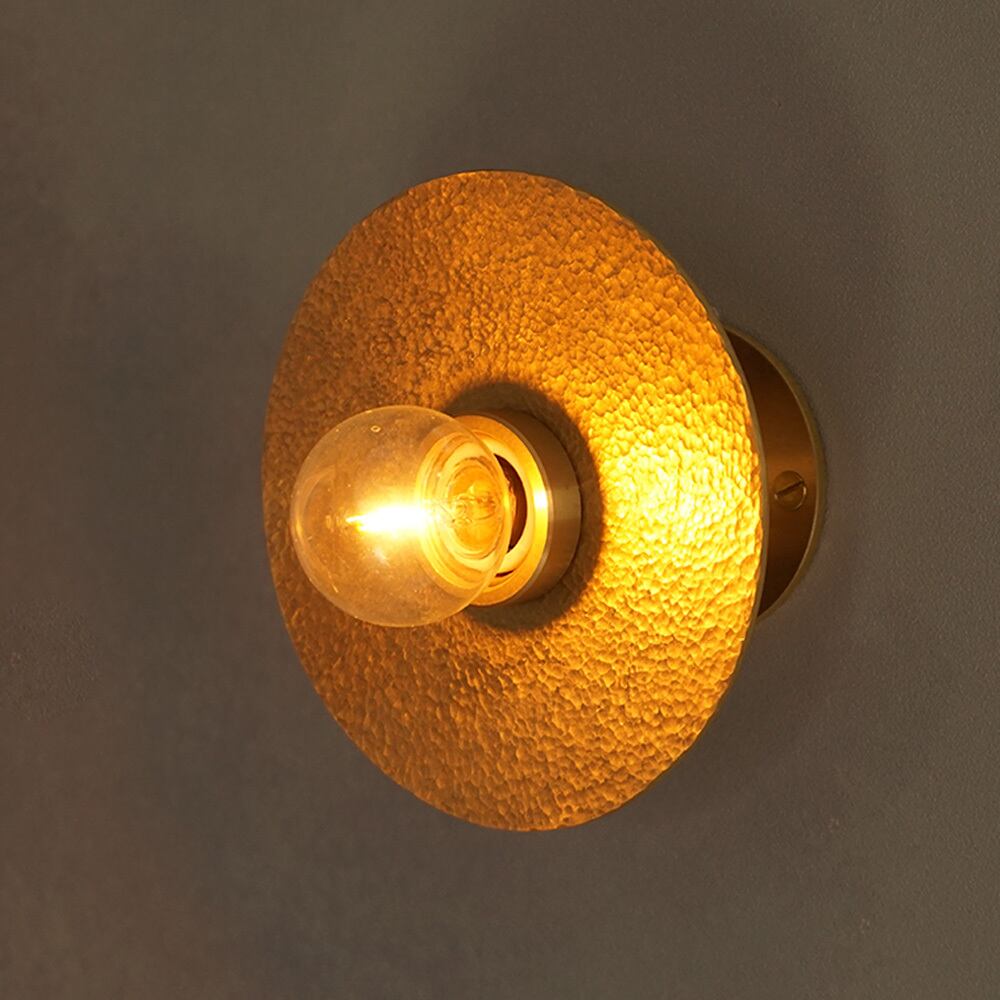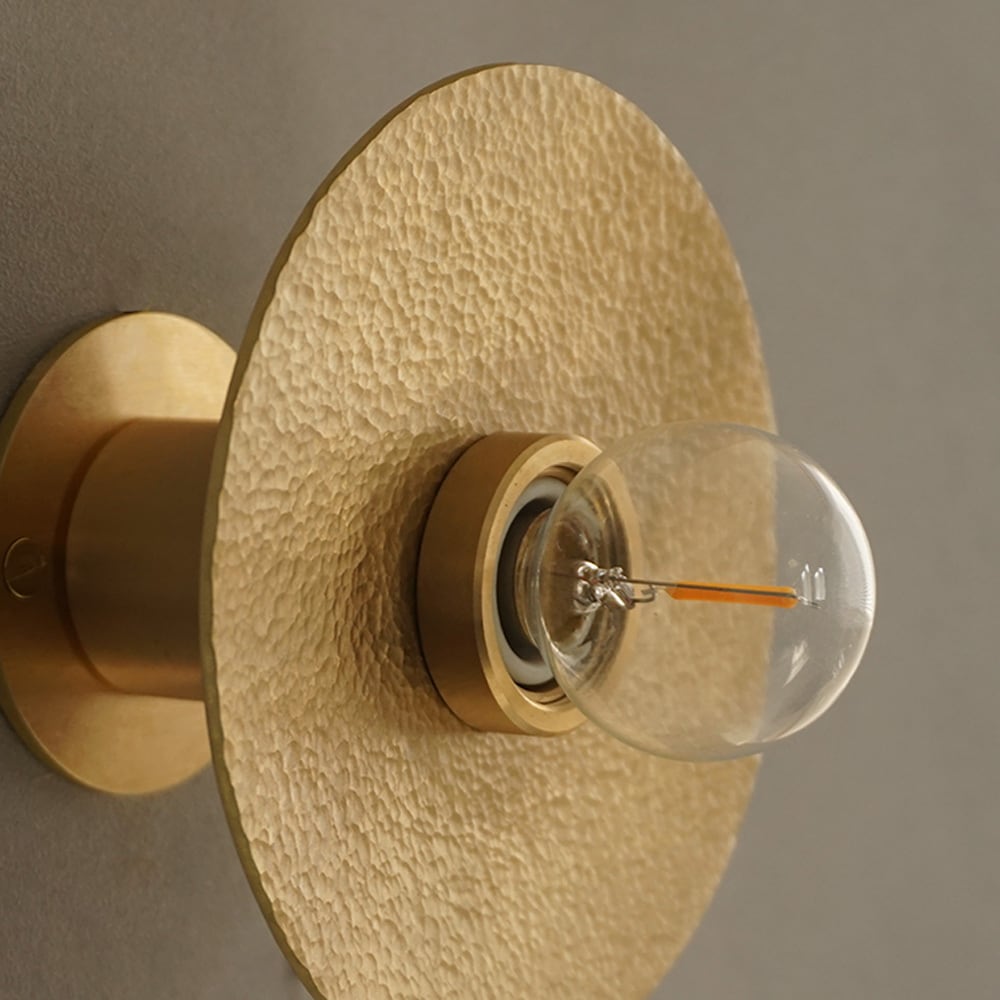 円形の真鍮(しんちゅう)プレートに、職人が一つひとつ槌目(つちめ)加工を施したブラケットライト。
