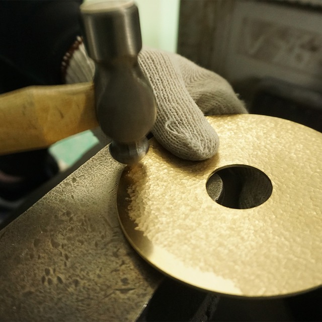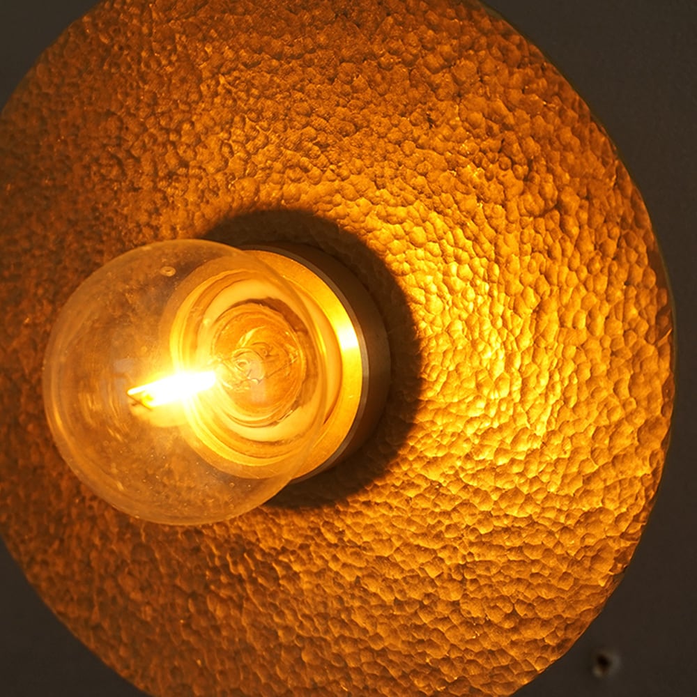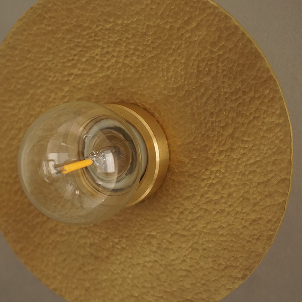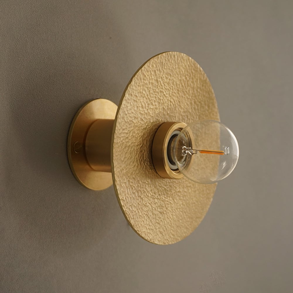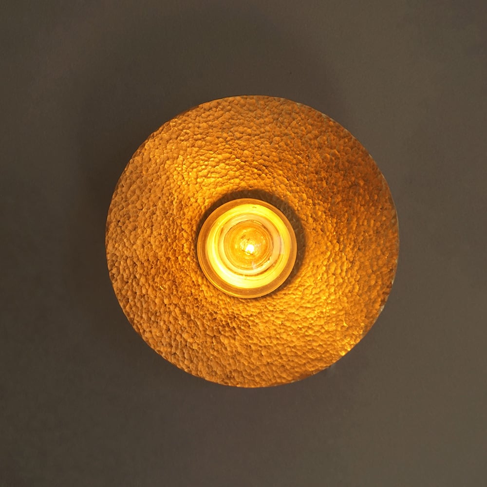 円形の真鍮(しんちゅう)プレートに、職人が一つひとつ槌目(つちめ)加工を施したブラケットライト。