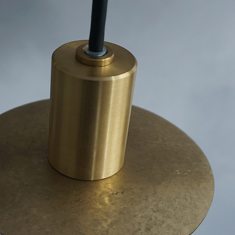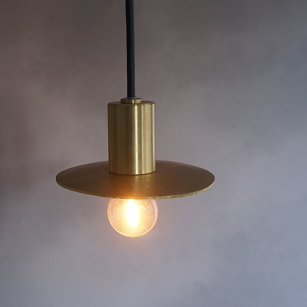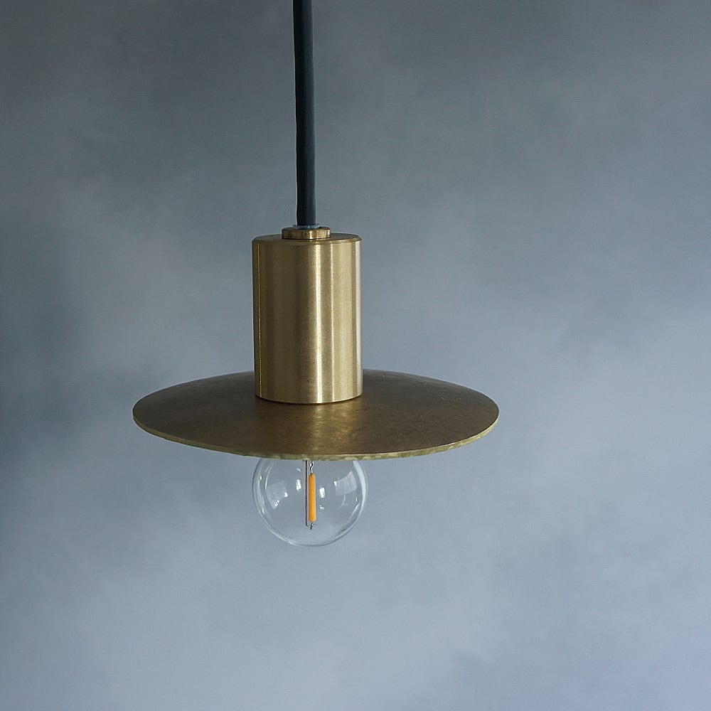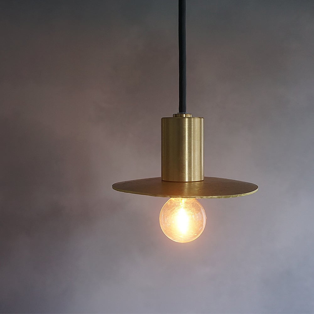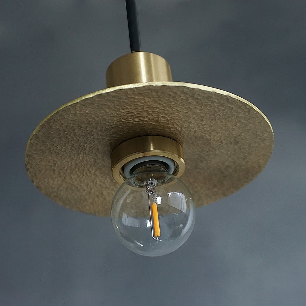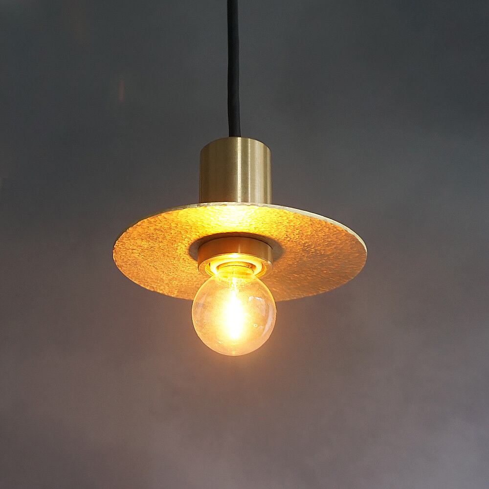 円形の真鍮プレートに、職人が一つひとつ槌目(つちめ)加工を施したペンダントライト。
