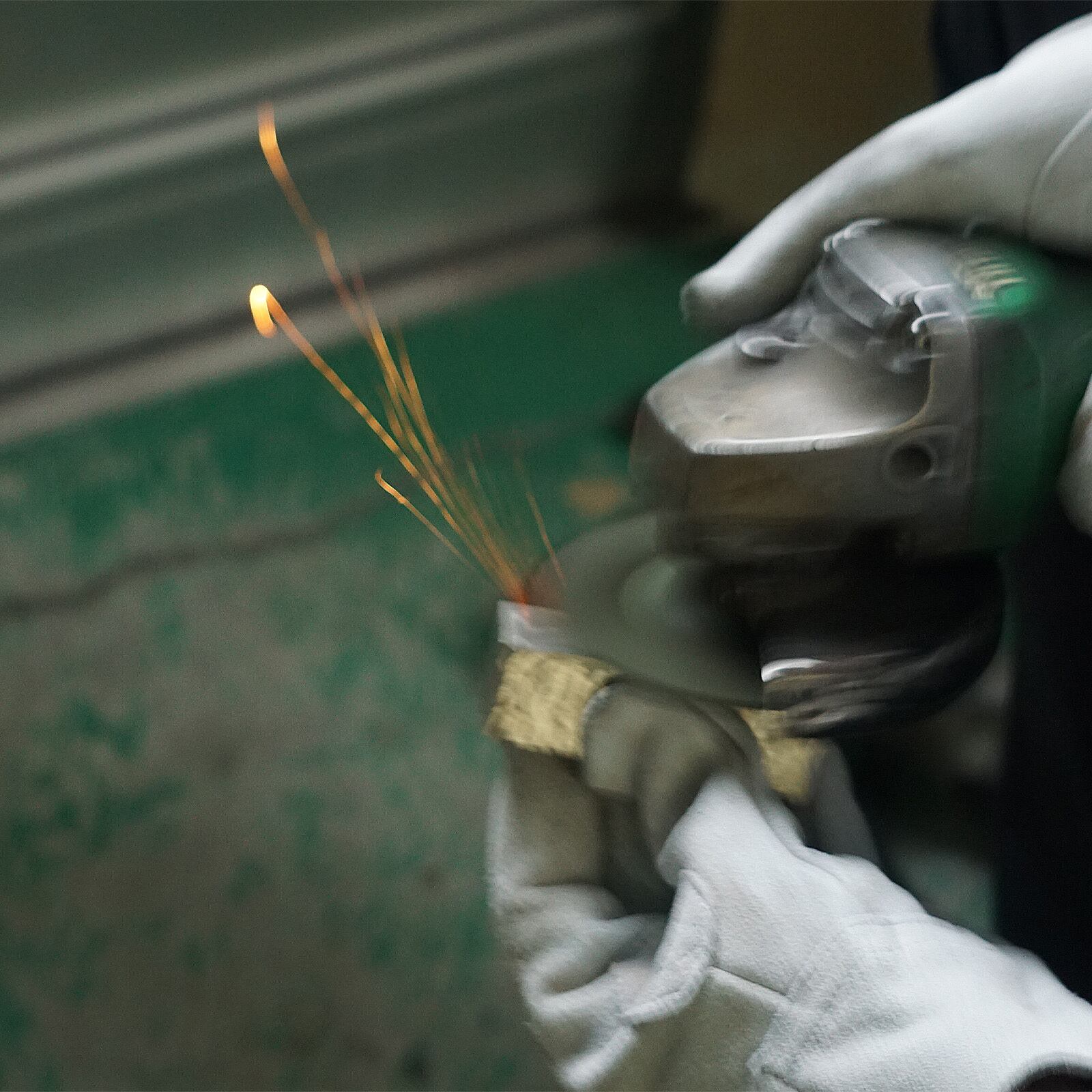 伝統的な「一刀彫」の技法を真鍮へと写し取り、小刀をイメージした大胆な削ぎ目を入れました。